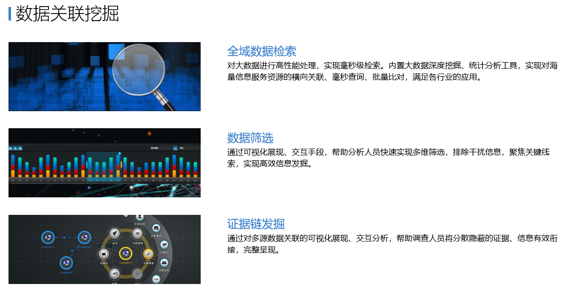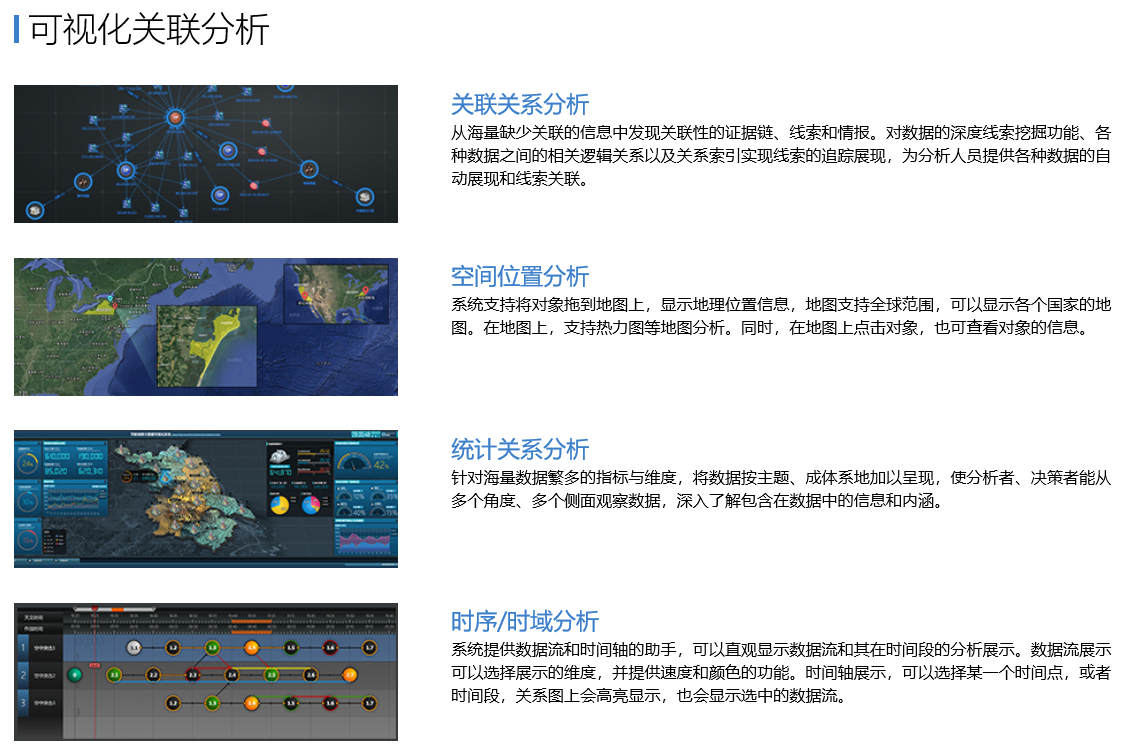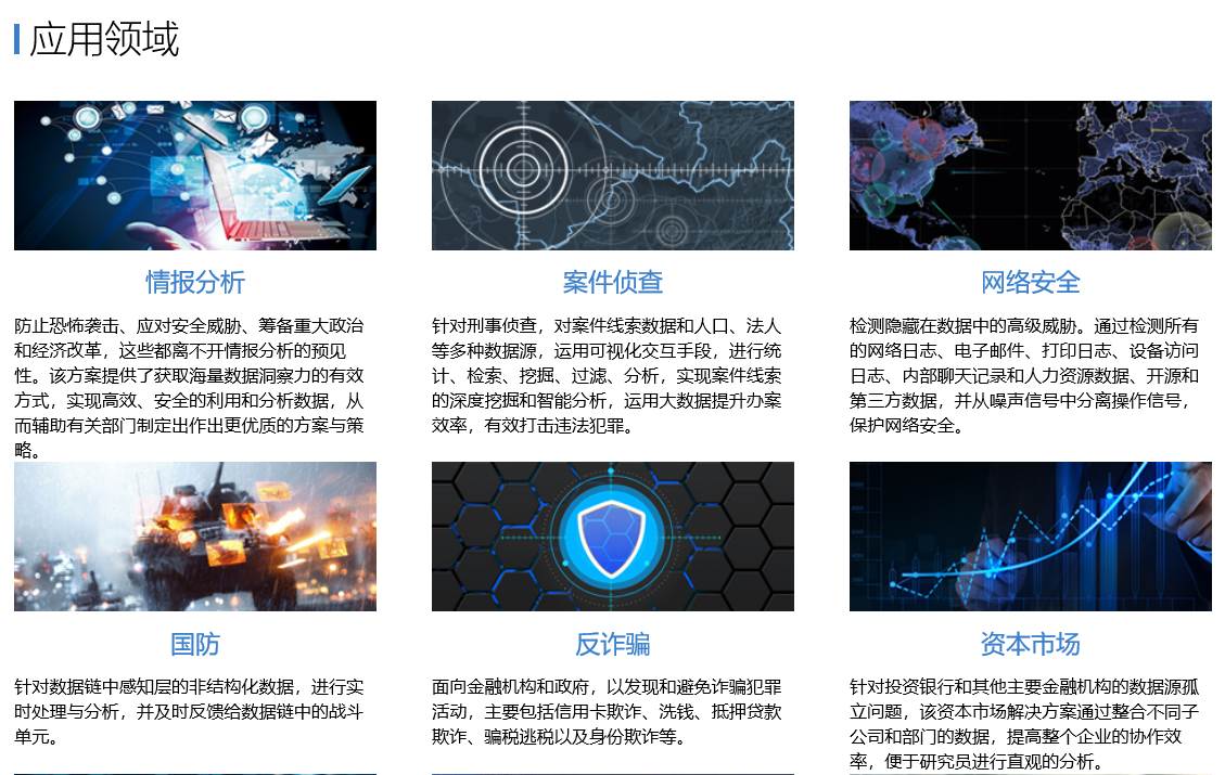 • 可視化情報(bào)分析平臺,是面向情報(bào)調(diào)查和分析人員的可視分析專業(yè)產(chǎn)品。平臺針對多源易構(gòu)的海量數(shù)據(jù),通過數(shù)據(jù)處理、存儲管理、可視化交互分析等技術(shù),實(shí)現(xiàn)圖形化情報(bào)信息查詢、可視化關(guān)聯(lián)分析、證據(jù)鏈和情報(bào)線索發(fā)掘等功能。平臺旨在利用人的洞察(價(jià)值判斷)把人的思想與計(jì)算機(jī)的運(yùn)算能力結(jié)合起來,通過直觀的可視、交互手段,幫助人捕捉到事物之間的關(guān)聯(lián)線索。平臺可廣泛應(yīng)用于網(wǎng)絡(luò)安全、反詐騙、案件偵查、情報(bào)分析、國防安全等領(lǐng)域。